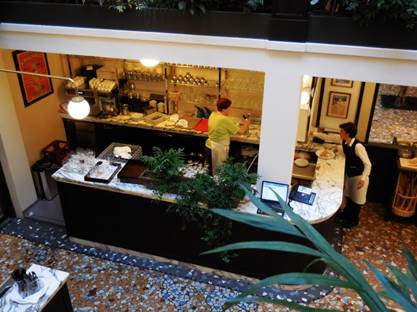 Desserts are prepared behind the former bar, at left. Bread is held in a basket under a little