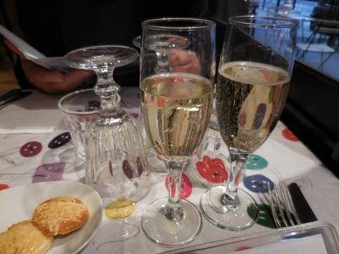 before they met). You could hear the “burn-out” in Serge’s words, so it wasn’t surprising that he gave up his Paris restaurant sometime within the next year or two. Last year, we noticed that the resto at that location now, called La Table d’Hubert, looks promising. I tried to make a reservation there a week or two ago, but after initially confirming the reservation, Lafourchette.com then sent an apologetic message to me stating that the resto would not be able to honor the commitment. My conclusion was that the resto had forgotten to tell Lafourchette.com about its vacation closing. The closing wasn’t for more than a week or so, however, because I recently noticed the resto promoting itself again on Lafourchette. So I made a reservation for last night. The 30-minute walk to dinner took us all the way down the avenue Félix Faure, from beginning to end. We just love walking that oh-so-Parisian avenue! We were two or three minutes early, before the 8PM opening time. So we stood out on the sidewalk, but Hubert graciously welcomed us in. At least, we think he is Hubert, so we shall call him Hubert. While we were admiring the fun tablecloths decorated with images of colorful buttons, Hubert brought us two complementary glasses of champagne -- good champagne! -- and a little plate of homemade biscuits, in the British sense of the word “biscuit.” Hubert always seems to have a barely discernible smile on his face. I think he likes his work.