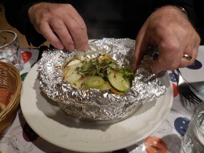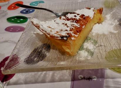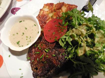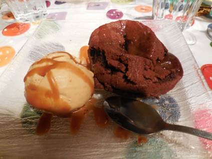 We nibbled biscuits while we perused the menu. In a case of role reversal, Tom decided to order salmon and I decided to order steak. First, though, we started by sharing six Burgundy escargots, served piping hot in the shells. There was excellent chewy bread to sop up the extra garlic-and-herb butter. There were even two little wrapped bits of butter in the bread basket! Rare! Tom’s salmon and veggies came in the papillotte in which they’d been roasted. He said the dish was delicious. My steak was wonderful: tender, juicy, flavorful, slightly charred on the outside and rosy and moist on the inside. Steak does not get any better than this. I loved the pepper sauce that accompanied it, even if some reviewers think it is too runny. In my opinion, its texture just made it easier to soak into and blend with the steak flavor. And I think its consistency was an indication that it was truly homemade. I had enough extra sauce to pour a bit onto the dauphinois potatoes, which were absolutely fine. I just like everything to be a little more peppery, I guess. We were so impressed with the food that we each ordered our own dessert: a mi-cuit au chocolat with homemade caramel ice cream for me, and a lemon tart for Tom. Both were very, very good. There were two groups of women dining at the resto; both having a great old time. There were some other tables occupied by small families, all having fun. The ambiance was buoyant, even as it drizzled rain outside during part of the dinner hour. We will certainly return to La Table d’Hubert!