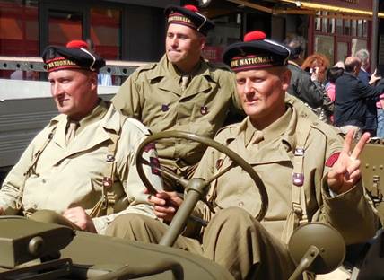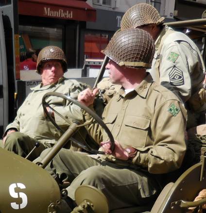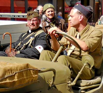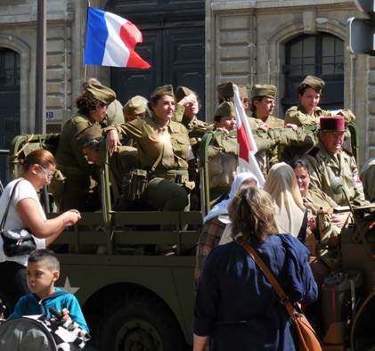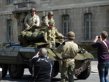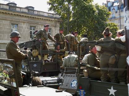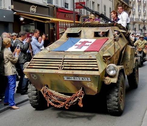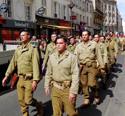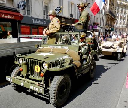 I never forget that August is the month for the anniversary of the Liberation of Paris in 1944. That makes this the 70th anniversary. When I left the apartment for a walk yesterday afternoon, however, I wasn’t thinking that much about exactly what day it was. I did a mundane errand, going to Monoprix to buy soaps and shampoos without metholisothyozolinone. That chemical, in combination with the high levels of calcaire (limestone) in the water here is wreaking havoc with Tom’s scalp. And it isn’t great for my skin, either. I stood in the shampoo and soap aisle for a while, reading labels, alongside a young man with very long, thick, dark hair. He was just as concerned with the ingredients as I was. Good boy, I thought; protect that gorgeous hair! Choices made and paid for, I exited the store and decided to walk farther, up the avenue de la Motte-Picquet, toward the Champ de Mars. As I approached the intersection of the avenue du Suffren, a fascinating scene appeared before me. Many vintage military vehicles and people in vintage military uniforms were assembling in front of the École Militaire. Naturally, people with cameras were gathering around them. I joined the fray. As I snapped photos, I heard someone say that the vehicles were headed for the Arc de Triomphe. Soon enough, they started the engines, one by one, and took off, single file, turning up the avenue du Suffren toward the Seine and the Champs Élysées beyond. I continued my walk up through the peaceful, shaded edge of the Champ de Mars, turning back down the avenue du Suffren when the bag containing the shampoos and soaps felt heavy. As I began to walk down the rue du Commerce, I felt many eyes upon me. They weren’t really looking at me; they were waiting for the military parade to come back. Evidently, it was supposed to go down the rue du Commerce, right through our neighborhood. I realized that there would be at least several minutes yet, if the parade/convoy was coming back all the way from the Arc de Triomphe, so I hurried home to deposit my bag and to tell Tom what was happening. Then I left the apartment again and he followed me out, to watch the parade from around the corner, in front of the Café du Commerce. Many more people were assembling along the curbs, waiting for the show, but there weren’t so many that it amounted to any more than one or two people deep along the edges of the street. There was plenty of space for taking photos. Tom tired of waiting, so I told him I’d call the apartment when I could see the convoy approaching. He left. Finally I saw the front motorcycles approach, signaled Tom with the phone, and got ready to take video first. You can see that video on my Facebook page. After the video, I took more still photos. So the still photos are in two groups: first, the ones I took up by the École Militaire, as the parade was forming, and then second, the ones taken on the rue du Commerce, after I made the video. I think there are about 70 photos that turned out well enough to keep. Click here for more photos on my keepandshare page. Each year, when this anniversary happens, I think of my uncle George White, my dad’s oldest brother, who died in France in October 1944. He was in General Patton’s army, advancing toward Germany, when he was shot by a German sniper near Fort Driant, which was near Nancy. My grandmother was devastated; she had his body returned to the U.S. for burial. I’ll never forget about him, and I hope others in the White family will always remember this, too. Someone who saw the video I posted yesterday remarked that the re-enactment of the allies coming into the liberated Paris was seemingly accurate, but the mood was more solemn than it must have been in 1944. I suppose that is true; but maybe it is solemn because so many people watching yesterday are remembering relatives who were lost in that war. Family life is very important in France. This weekend, we’re seeing families and friends gathering together as they return from vacations. We saw much of that yesterday at dinner, at Bistro 121. We were in the mood for a simple, weekend-style roasted chicken and vegetables dinner, and Bistro 121 has just that, in the form of a double plat for two to share. It was good, simple food, which we followed up with a crème brûlée for me, and a rich chocolate lingot (fudge) for Tom.