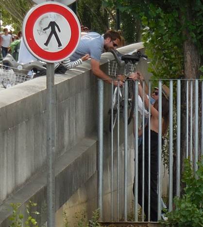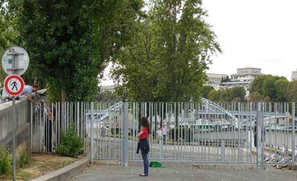 blocked by this fence and gate on the Port de la Bourdonnais. Here you can see a bicycle being handed up