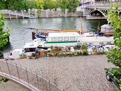 The New York Times chose to call the Berges de Seine project “a playful path along the Seine.” Well chosen words! The riverbank is playful, or perhaps we should say it is playful once again. Once upon a time, before the expressway was constructed on the riverbank, it was a playful path. The Quai de Grenelle was and still is a playful path, because it was never turned into an expressway. That’s where we chose to walk yesterday. We started with our usual walk up the rue du Commerce, avenue de la Motte-Picquet, and the elegant residential street that goes just outside the southwest border of the Champ de Mars. This street changes names too many times to count, but it is really just one long street. I suppose there were too many important men who had to have streets named after them at the time when these buildings were built. We like walking there because of the wide sidewalks, mature trees, beautiful Haussmannian buildings, and no commercial businesses; this is a totally residential area. So we crossed the Quai Branly just west of the Eiffel Tower and walked along the elevated bank until we reached the beautiful bi-level Pont de Bir Hakeim, which is now getting a facelift. After crossing the big intersection there with all its frantic traffic, we began our descent – down the ramp, to the real riverbank of the Port de Grenelle. I recently read that the Île aux Cygnes was constructed in the middle of the Seine to protect the Port de Grenelle. Then I checked the map; indeed, the river is wider there, just as it bends to the southwest. We saw a good demonstration of why the port needs to be protected, because a rainstorm suddenly poured down upon us. There is no good place to seek shelter down there on the riverbank, so we stood beneath a couple large plane trees, and up against the huge retaining wall where there was a slight outcropping above us – giving a bit of protection from the rain. The wind blew from the west, and the rain poured. We looked at the river before us. The water heaved and swelled; the river was in muscular, turbulent motion. Water is powerful, the Seine reminded us. We could see why it needs to be controlled, to protect the port. In my mind, this resolves the question about whether the Île aux Cygnes should be part of the 15th or the 16th arrondissement. The island was constructed to protect the Port de Grenelle, which is on the 15th side of the river, and it does just that. So the 15th arrondissement should be taking care of the Île aux Cygnes, in my opinion. About those cygnes (swans) – they do exist. We’d seen them years ago, when we looked down the steeply sloping bank of the Île on its Grenelle side. But since it had been so long since we’d seen any swans, I was thinking they were gone now. But no! Yesterday we saw a swan as we stood partly sheltered from the rain, looking over at that side of the Île aux Cygnes! I was so happy to see this graceful waterbird. After a while, the rain let up somewhat so that we were able to walk on to take shelter under the RER train bridge which crosses the Seine near the middle of the Île aux Cygnes. This artificial island was created in 1827, a scheme of two businessmen who were also elected officials of Vaugirard (the other village near Grenelle). Their names were Jean-Léonard Violet and Alphonse Letellier. Both of these men owned real estate in the area, and both now have streets in the 15th arrondissement named after them. I’m sure this improvement of the Port de Grenelle helped their real estate values! The walkway that runs the length of the Île aux Cygnes is called the Allée des Cygnes. It was created in 1878, and is about 850 meters long, 11 meters wide. A total of more than 300 trees line the sides of the Allée, including over 60 species. As we stood under the RER train’s bridge, two extended families joined us in seeking shelter there. One was Japanese; the other was German. They all were chattering away, with about six or seven conversations happening at once. The rain let up some more, so we moved on a bit to position ourselves under the overhang of a port building. Ah, peace and quiet returned. That reminds me that earlier, just as it was beginning to rain, we were stopped by a nice couple who asked us, in French, how to find the dinner-cruise boat called the Capitaine Fracasse. We began answering in French, but then I realized that their French was halting. So I asked if they spoke English. You should have seen the look of relief on their faces as we switched to English! I think they were native speakers of Portuguese, perhaps from Brazil. The Capitaine Fracasse boards and leaves from the Île des Cygnes, on the Grenelle side, close to the Pont de Bir Hakeim. This cruising resto gets good reviews on TripAdvisor, and we’ve passed it many times. But we’ve never taken this dinner cruise. In the top photo on this page, the steps you see in the upper left corner, leading down to the water, are the ones you take to board the Capitaine Fracasse. At the time I took this photo, the boat was out picking up its crew and wait staff. Another thing I should point out about the Île aux Cygnes is that it is NOT the same as the much earlier Île des Cygnes. Some of the English-speaking walking tour guides in Paris give false information about this. The older Île des Cygnes was formed by merging some smaller islets. Then the Île des Cygnes was merged with the left bank in the late 1700s. The Musée du Quai Branly sits on what was once the earlier Île des Cygnes. Even earlier, the Île des Cygnes was called the Île Maquerelle. Its name was changed by royal decree when swans were introduced to the island, in 1676. So if you have a tour guide who tells you that the current Île aux Cygnes is the one that the king had populated with swans back in 1676, that guide is wrong. The current Île aux Cygnes didn’t even exist then. Here’s another interesting but sad and gruesome fact: about 1200 victims of 