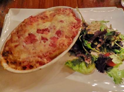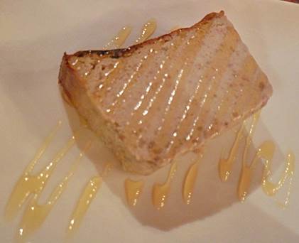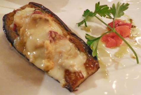 In passing, we’d recently noticed that L’Accent Corse is has re-opened, after the typical August vacation. In the afternoon yesterday, as we were winding down our work day, I made a dinner reservation there. So the natural route for us to walk before dinner began with a visit to the Square Saint-Lambert. We sat for a few minutes on a park bench to watch a wedding party gathering in the lower level of the terrain, next to the fountain. I was pleased that the fountain has water in it this year, and is operating beautifully. Last summer, it was empty. The wedding had probably just happened at the nearby mairie (city hall for the arrondissement) and after a pause in the park, the group would probably move on to dinner at some local establishment that could handle their number. After the group started to move on, we did, too. But somehow, our route to the gate must have been shorter, for we ended up almost getting mixed up with the wedding party. So we stepped aside and waited for them to go ahead. They turned off to the west, but we went on to the south to walk across the gracious parvis in front of the mairie, and then uphill through the Square Adolphe Chérioux. The rise in elevation there is actually the beginning of the hill called Montparnasse, although one wouldn’t call that particular neighborhood Montparnasse. We walked along rue de Vaugirard and then rue de la Convention. At last, we were there, at the lovely restaurant called L’Accent Corse. It is right next door to Bistro 121, which never closes in August. I did a fairly extensive write-up of L’Accent Corse in July of last year. I mentioned that the boss, Marc-Ange Spinosi, is the son of Corsican restaurateurs. He’s had a restaurant at this prime location on the rue de la Convention for four years now. The spot was once home to a traditional Lyonnais bistro, and had been beautifully renovated in an over-the-top Art Nouveau fashion, which we adore. The decorator was the well-known (in Paris) Slavik Vassiliev. I imagine that Marc-Ange goes back to Corsica for his August vacation every year; and then he returns to Paris with goodies like Corsican honey supplied by his cousin Dominique. Marc-Ange greeted us and gave us a nice table in the front. He explained that there was no rillette de truite maison this evening (trout spread). I can appreciate that if fresh trout is used, it just might not be available every day. So instead, we started by sharing an order of aubergine a la Bonifacienne. This soft, roasted half of an eggplant is topped with a savory, warm mixture of Corsican cheese (tomme, I think) with eggs, garlic, lardons (ham bits), and onions (photo below). I think there are supposed to be bread crumbs and milk in this dish normally, although I could not detect them in this particular version. And I think the lardons and onions were a unique addition. However it was done, it was done very well. Each bite melted in my mouth, full of flavor.