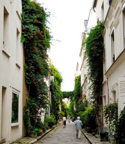 buildings on rue des Thermopyles are draped with wisteria and other vines,