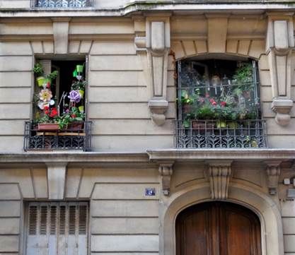 floral display in apartment windows on the rue Beaugrenelle.