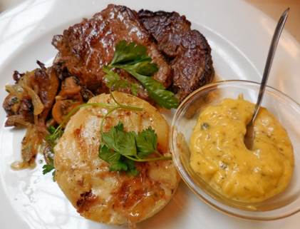 rib steak with potatoes au gratin, sautéed mushrooms, and Béarnaise sauce.