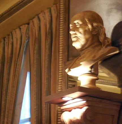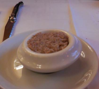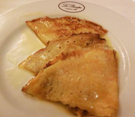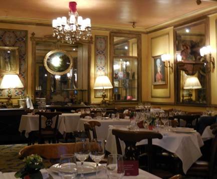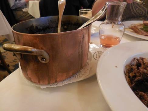 When I left the apartment for an errand to Monoprix, I was unprepared for the chaos on the square. I’d forgotten that it was brocante weekend on the Place Saint Sulpice. So many neighborhood residents wanted booths for selling their cast-offs that the square could not hold them all; the sidewalks around the square were used as well, making the rue Palatine along the south side of the square almost unnavigable. The square was absolutely jammed with people – mostly locals. Somehow I made my way around and past it. Then I was amazed at how many people crowded the sidewalks on the rue Bonaparte. Monoprix was busy, too; it was already 5 or 6PM. On my way back, I avoided the Place Saint Sulpice as much as possible, but I had to navigate the rue Palatine, or else go far out of my way. The peace and quiet of the apartment felt so good as I shut the door behind me. When we went out for dinner, the streets were still busy, but not impossible. We went around, via the rue des Quatre Vents and the Carrefour de l’Odéon to walk directly across the boulevard Saint Germain to the rue de l’Ancienne Comédie. Our dinner reservation was at the venerable Procope – “the oldest café in Paris” (although it has not been in continuous operation). It isn’t a café now, but rather an elegant restaurant. Our reservation was early because we wanted to get a table afterwards at Café Laurent to hear live jazz, and because Tom prefers to eat early during times like this when he is working hard on a book. He sleeps better if he eats a bit early, by Paris standards. Unfortunately, the early reservation time in this particular area means being surrounded by tourists, mostly American. Now I like Americans very much, but some of them are so uncomfortable in Paris (particularly in a posh restaurant like this where more is at stake) that they make me uncomfortable just seeing and hearing them. Also, there are those few? several? among them who are just plain rude. I gained a whole new level of appreciation for Parisian servers last night. The job is difficult, and these professionals pull it off with such finesse. I noted that sometimes tourists seem rude because they are too blunt in their speech; they don’t use enough nice fillers like please, thank you, that’s so nice, that’s so kind of you, oh I really appreciate that, that was really good. But last night I concluded that one reason they don’t is because they’re nervous. So we use our ultra-polite French to put these servers at ease, and to thank them, even though they speak English quite passably. I’d done my research on Le Procope and its specialties, and decided in advance that I would order either the coq au vin or the rognons de veau (calf’s kidneys). Because rognons de veau must be cooked just right or else they’re either gross or rubbery, I decided to order the coq au vin this time, in hopes that we go back again. Now I am certain that we will go back. The food was heavenly. My coq au vin, which arrived in a copper pot, was bursting with rich flavor.