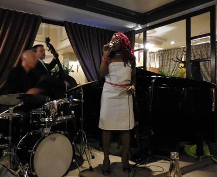 Tom’s lamb chops could not have been better. We ordered dessert, too, even though we were running out of time. Tom had the profiteroles, and I had crêpes flambées au Grand Marnier. Outstanding! The man from New Jersey at the table next to us was not just nervous; he was truly rude and drunk. His use of foul language was almost too much for me to tolerate. By dessert time, I wanted so much to move to a different table, but there were none available. The dining room was full. We stayed put and endured the rude cacophony from the New Jersey man’s mouth. The man’s wife tried to make up for her husband’s poor manners by starting a conversation with us. She asked where in the States we were from. Tom answered, “Florida,” but I think it was apparent that we wanted to be left alone. Then I explained to the server, in French, that we had a concert to go to, so would it please be possible to have the check, while we were still having dessert. He was very nice about that; I think he could sense why we wanted to get away from New Jersey. By the time we reached Café Laurent, the music had started, but “our” table was still available. We sat right down and made ourselves comfortable. Soon, Laurent was at my ear, asking what we’d like to drink. I smiled at him and gave our order; to show he remembered us, he finished saying the last part of the order for me. I grinned and said a big “merci, monsieur!” He smiled back. With our drinks, once again Laurent brought us a special little treat of peanuts and dried fruit bits in one shot-glass size dish, and olives in another. He only gives these to his favorite customers, it seems; although I’m sure if anyone asked, he’d bring them the treats as well. Laurent has that café running like clockwork. And the music flowed. Christian Brenner is a supremely talented pianist and musical leader, and yet he is so humble and generous. I just love that guy for his talent, and for the way he shares the limelight. For Christian, it is all about the music and people enjoying it. The amazing Olivier Robin was playing drums again, and a bass player whom we’ve heard there in the past, Gilles Naturel, accompanied them. Monique Thomas, the guest vocalist, was fantastic. Her voice is like gold, and she’s been well-educated and trained as a jazz musician. She’s recently started a school to teach European vocalists how to sing in English with an American accent and clear diction. Monique is originally from Philadelphia, and she is not to be confused with the British singer named Monique Thomas, who, in my opinion, is not as gifted or accomplished as the American Monique (although the British Monique is better known, judging by numbers of YouTube views). The American-French Monique sometimes uses her married name, Monique Thomas-Ottoviani. She’s married to a drummer from Bordeaux, Didier Ottoviani. She uses her voice like a saxophone or clarinet, although she is capable of being a trumpet, too. Her voice is sweet and clear, yet strong and full. I could just sit and listen to her for hours. But after two sets, it was time to go. We’d enjoyed being there, and the audience (mostly Americans) was super appreciative and polite. When we left that ultra-civilized and comfortable place called Café Laurent, we went back out into the wild streets. And I mean wild, as in “savage.” At that hour, almost midnight, half of the people out there are drunk and really loud. They’ve lost their inhibitions. How anyone can live or sleep in that neighborhood, on the rue Dauphine and the Carrefour de Buci area, is something I cannot understand. Then the normally calm rue Palatine was assaulted by the noises and drunken screams coming from a wild party in a second-floor apartment with open windows. We turned the corners, and even on the rue du Canivet, there was a group of teenage girls sitting on the pavement, drinking rum and coke. Yuck. “Be prepared for hangovers, girls,” I thought to myself. Still, when we ascended to our apartment, all was calm, all was quiet. Bonne nuit!