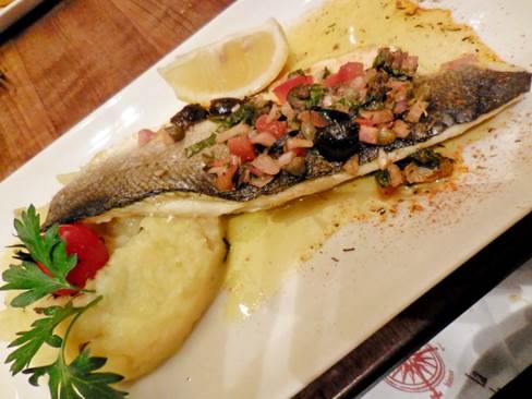 I ordered the sea bass filet and smashed potatoes (below). The sea bass came in a little pool of clarified butter, topped with a Mediterranean smattering of sautéed olives, onions, tomatos, garlic, etc. The dish gave me that wonderful restorative feeling that the combination of fish, butter, and potatoes can give. Aaaahhhh.