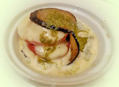 Petit chausson d’aubergine, tomates et mozzarella au curry et grains de carvis, a special of the day featured on the blackboard
