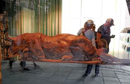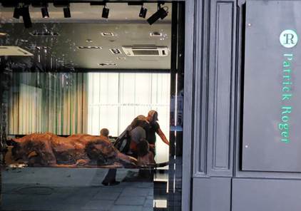 A chocolate cougar sculpture in the window of a chocolate