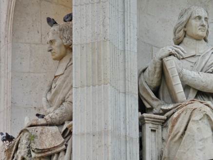 The restaurant gave us complimentary champagne and tapenade hors d’oeuvres to begin our feast. Au revoir, Café du Commerce. A l’annee prochaine! The excellent dinner was a fine send-off from the 15th. Cynthia S. wants to know more about our “new” quarter. It is not really new to us, of course, because we have been here for many Septembers now. But she means “new” in the sense that we just moved yesterday, from the one quarter to the other. These two left-bank arrondissements are very different, but Tom and I do not attempt to compare them in an evaluative way. We would not say that we prefer one over the other. If forced to phrase it very succinctly, I’d say that the 15th is more for living in Paris, and the 6th is a great place to stay if you are visiting Paris. But that’s selling the 6th a little short, and I don’t want to do that. And to say that the 15th is more authentic because you hear more French spoken there and much less English is also probably not fair. The 15th was only annexed to Paris in 1860, so it is much newer, but when we look at it, we would hardly say it is “new.” Some of it is, and some of it – with its old village-y charm – decidedly is not. The building where we are now was built in 1640, and the big door that the taxi driver was pushing open as he said, “this is pretty” is a listed historic monument. An objective observer would say the door looks knarly and old, not pretty. But to one who is smitten by the history of Paris, in the context of the building, the street, and the quaint courtyard within, that door is darned pretty. To enter the courtyard from the street is to pass through a “once upon a time” charming space. Once we were unpacked, settled in, and had a nice visit with our friends Ron and Elisabeth, across the landing from us, we ventured out to find some basic supplies. The irony of being here, even closer to the centerpoint of this great city, is that the grocery stores and other things we need for everyday living are farther way, a longer walk, than they are in the 15th. But I suppose that may be true in many big cities; for example, going to the grocery if you live in Brooklyn is probably generally more convenient than it is if you live in Manhattan. I knew that on a Sunday afternoon, our only neighborhood option was the Carrefour Express on the rue de Vaugirard, and Ron had confirmed this in our conversation. Fortunately, the very good bakery that we passed on the way was also open. So after we bought a few things at the frenzied, crowded, little Carrefour Express, we stopped at the bakery for a fine baguette. The long line in the bakery moved along quickly. Back at the apartment, we rested briefly and then walked out to the Place Saint Sulpice. We sat on a bench, gazed at the stately fountain, and watched a young man speaking to a group of people. I think these were potential new members of the Église Saint Sulpice.