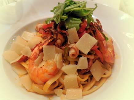 Prawns and calamari on linguini, with Romano cheese, at La