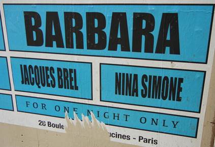 because her writing is generally too acerbic for my taste. But this was a good column, on la tristesse. We haven’t seen that much evidence of it yet. But we will be on guard, and will be especially kind – even kinder than usual – to Parisians this summer. We like to be kind. It feels good. People who know me know that I prefer to be called “Barbara,” not “Barb,” because, as I explain, a “barb” is something sharp that can hurt you. I don’t want to hurt anyone. It occurs to me now that we’re here, speaking French, that another reason is that it is perfectly possible to say “Barbara” in French (bah – bah- RHA), and it even sounds kind of joyful. It sounds like fun, like baba au rhum. But just try to say “Barb” in French. Just try it. Without an “e” on the end, it sounds like you suddenly choked on a sock. It is almost impossible to pronounce. The pastor at my church back home hasn’t known me for all that long, so he calls me “Barb.” But he speaks French beautifully, and I think he’d understand this explanation quite well (as well as my normal explanation). Speaking of bad moods, Doc Salzman was having a bad day yesterday. As we waited patiently in the waiting room, it was apparent in the moments that she appeared and interacted with the receptionist that she was distressed by a number of things. And then she discovered that the toilet in the bathroom was clogged. But when Tom was called in to see her, she was thorough, kind, professional, and a good listener. Good for you, Doc Salzman! We were very favorably impressed. And we feel “safer,” as our friend Barbara C. said, with a good doctor to rely upon, should the need for a doctor arise. Barbara, Barbara, Barbara. The name is so common among those of us born in the first 60 years of the 20th Century. I checked out the Olympia’s web site to see about the “Barbara” mentioned in the poster we saw on the Île Saint-Louis (see photo at right). The Olympia web site has an interesting page about Barbara, a popular singer born as Monique Serf in 1930, in Paris. She was Jewish. Her mother’s family came from central Europe. They had to flee Paris at the time of the German occupation. Like so many families, they went south, in this case, to Saint Marcellin, near Grenoble. I know of Saint Marcellin only because of its cheese. Now I will know it as the place where Barbara’s family went during the occupation. They returned to Paris at the time of the Liberation. She would have been 15 at that time. She already knew what she wanted to do with her life: she would be a singing pianist. Although she came from modest circumstances, she managed to study at the music conservatory on the rue de Madrid. Although she studied classical music, with her mezzo soprano voice, she was attracted to the popular song. Edith Piaf became her role model. Upon leaving the music conservatory, she tried to make it in the cabarets of Paris, without success. Off she went to Belgium, where she found some success, and adopted the name Barbara Brodi, which was based upon her Russian grandmother’s name. About the time I was born was when Barbara Brodi’s career started to take off. She returned to Paris in 1955, where she “forced open the door of the Parisian cabarets.” She came out with albums in which she sang her own compositions in 1964 and 1965. She was married once, briefly, but had many affairs. Success was difficult for her. She was afraid of the oppressive adoration of her fans. She was maniacal in her preparations for a new show. She was tormented by childhood memories (sexual abuse by her father, who later abandoned the family), and she suffered from insomnia. She tried to kill herself in 1974. She chose a place outside of Paris to make a comeback. It was in Pantin, on the outskirts of Paris. There she put on a show that was more “American,” with sophisticated arrangements and special effects. She was pushed by her perfectionism. Her friends thought she’d become a caricature of herself, but the show was a success. Her voice weakened, but the emotion was stronger than ever, and that's what appealed to her audience. While she was at Pantin, she met Gerard Depardieu, and began to work with him. Together they made a popular show in which she portrayed someone like herself, and he portrayed a criminal inspired by her singing to kill.. They went to New York with the show. She joined with other celebrities in the fight against AIDS. She even sang at prisons, and distributed condoms at concerts. On her last album, produced in 1996, her voice was more broken than ever. She died from pneumonia the next year. La tristesse. So sad. I wish that Barbara had had a happier life. She was so very talented, and she brought joy to others, through her music. After returning to the apartment following the medical adventure of the day, we had happy hour and decided not to make a big deal out of dinner. We simply walked down to Café le Commerce, not to be confused with the Café du Commerce, our neighborhood pub. We dined simply in that cheerful, bubbly place. The terrasse, in particular, was jammed with chattering Parisians. We detected no morosity there. Cheers! |