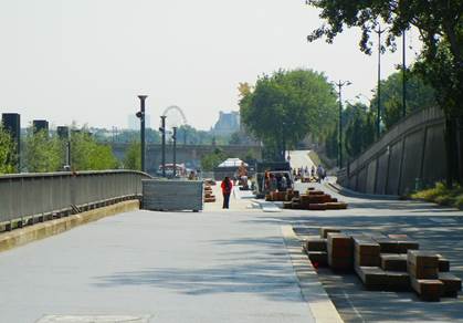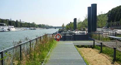 There was no shopping on vendredi for the Cooleys. Instead, we were explorers for the day. Friday was one of our best days ever in Paris. And that’s really saying something! First of all, the weather was perfect. Sunny, not a cloud in the sky, temperatures no higher than 78 degrees F. I’d suggested we walk up to the Seine to see the new pedestrianization improvements that we’ve been reading about in the past few years. This was it – many of the improvements were supposed to be completed, especially on our side, the left bank. After thoroughly enjoying a normal walk up around the Champ de Mars and on through the garden of the Musée du Quai Branly, we walked across the Passarelle de Billy only to see if the cat who lives aboard the Julia was out (he wasn’t), and we went on to the ramp where there used to be a highway along the left bank. We were accustomed to walking on that highway on Sundays when cars have been banned. Now, however, it is always a pedestrian area (bikes and rollerbladers, too). But the big change isn’t just that cars are gone – the huge difference is all the amenities that have been added. Tom and I are big fans of good infrastructure, and here it was, bigtime. Where to begin? First, perhaps, the barge. Or should I say barges? These are floating gardens and plazas. The officials call it the “archipel,” which roughly translates to “achipegalo,” but what they really mean is a cluster of floating islands meant for fun and relaxation. The relaxation is easy with some generous, double-size wooden lounge chairs. A delightful greenhouse rests on one of the barges. There are planters full of interesting vegetation, and some little floating beds of water plants that are struggling to take hold, but I think they will. French gardeners in Paris are highly skilled. We lingered on the archipel and enjoyed the sensation of movement, the gentle lilting of the barge, for so long that our inner ears still retained that sense of being afloat and in motion for a half hour after we’d left the barge. I mean, archipel. Everywhere, we kept finding great things for kids to climb and scamper upon. The whole stretch of amenities has so recently opened to the public that the kids haven’t found all these cool places yet. But they will, I’m sure. The serious infrastructure like the archipel wasn’t the only thing that impressed us. The simple planting of wildflower seed mixture where weeds once grew was a stroke of brilliance. Take what’s there already – i.e., native plants trying to take hold again – and enhance it, encourage it. That’s what the landscapers did – in all those dusty, barren places where weeds/wildflowers were trying to grow, wildflowers now grow profusely. Go with nature, don’t fight it. Wow. Look at the results! Simple infrastructure, like new higher curbs that more distinctly define the roadway are also an improvement. Pavers were not used in this section of the left riverbank, for the most part. Instead, most of the walking surface is blacktop, which is much kinder to the feet than pavers or cobblestones are. One of the inconveniences we’d long experienced on our long Seine walks on Sundays of the past was the lack of public restrooms. Who wants to go climbing back up to street level and walking for several blocks just to find a bathroom that one may use? Now, public restrooms exist at points here and there along the banks of the Seine. They will take a lot of maintenance, but they are so worth it, for the goodwill they will generate. Paris has long been criticized for lack of public restrooms, and so they added the sanisettes on the streets of the city. Now, the next improvement is here: the public restrooms on the banks. The riverbank now has places to eat, and lots of places where you can bring your own picnic (but no food is allowed on the archipel). What we initially thought were timbers waiting to be assembled into something else turned out to be already functioning as they were intended. They are meant to be used as benches. But they do resemble timbers waiting to be barged somewhere. So clever! One of the most unique additions is called Zzz. It is an area where solarium-like cabanas can be rented so that you can have a gathering or picnic with friends in your own rented space, for privacy from the passing masses. We did check out the places to dine. But since they are all outdoors, they all allow smoking everywhere. At every table, there was an ashtray. Also, there was just enough breeze to make dining out perhaps a bit challenging, and we found ourselves wanting the comforts of a fine brasserie as we worked up an appetite, walking so far. So we when we reached the end of this stretch of former highway, now pedestrian wonderland, we walked up the ramp just past the Musée D’Orsay and went into Le Frégate, an old favorite. It is a beautiful, classic Parisian brasserie, convenient to the Orsay and the Louvre. And the berges (riverbanks). Tom ordered a mushroom omelet and fries, and I had a chicken Caesar salad. All was good, except for Tom’s coffee after the meal. He’d ordered a double espresso, and received a yucky allongé (coffee diluted with hot water) instead. I am sure the server understood him, because she repeated une double, espresso after he said it, but she or the bartender wrongly, very wrongly, assumed that he really wanted what they wrongly call a café americain, or café allongé. Even with this serious strike against Le Frégate, we still like the place very much. We walked on toward the Île de la Cite, where the cobblestones begin on the left riverbank. By then, we were getting to be quite footsore. The Six Huit, a barge/bar where we used to stop for a drink only because the view was so good, is now gone. It isn’t a great loss, but in its place is a houseboat with a little ice cream terrace on top. I’m sure Paris can do better than that, for such a prime location! Next to it, however, is now Maxim’s