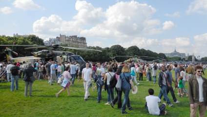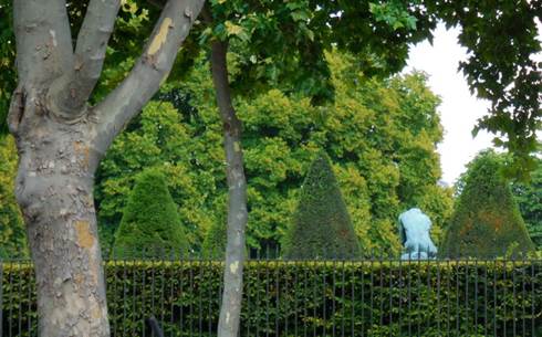 Surprise, surprise. Surprises all day long. The military parade was much more somber than usual; the theme was the 100th anniversary of the beginning of World War I, often called the Great War, but, from what I can tell, should perhaps be called the greatly traumatizing war – the terrible war, in both the French and English senses of the word “terrible.” This time, there were no paratroopers landing on the Place de la Concorde at the end of the parade. Instead, a large group of young performers wearing black and white released white doves from their hands. The mood was soberly focused on the need for peace. At one point, the announcer said something about France’s military being the strongest and most important in the European Union. My initial gut reaction to that was an incredulous, “Say what?????” But when I thought about it, I realized that it is true. Who’s got the strongest military in the EU? Well, we certainly don’t want it to be Germany. And it isn’t Britain, or Italy, or Spain. Yes, it is France! We walked up the avenue de la Motte Picquet in the afternoon, intending to walk along the streets of the 7th arrondissement, reasoning that there wouldn’t be much traffic on the national holiday. But the first part of the 7th that we reach is the foot of the Champ de Mars, in front of the military school. Gorgeous music filled our ears. It had to be live: a symphony orchestra, opera singers. Oh my! So we turned and walked up the tree-lined allée on one side of the Champ until we reached the area in front of the stage under the Eiffel Tower – the stage that we saw the evening before. There were throngs of people everywhere, of course, staking out their piece of the Champ for the show and fireworks later in the evening. Sure enough, there was a symphony orchestra practicing for the evening’s show. I had indeed heard an opera singer, and yes, I had heard part of Mozart’s Requiem. The sound system was the most powerful and perfect that I’ve ever heard. It was a premonition of things to come . . . . People often think that the oldest part of Paris is really the heart of it; they think of the Île de la Cite, the Île Saint Louis, and the 5th and 6th arrondissements as the center of everything. Yesterday, however, there was no doubt about it: the center of everything was the Eiffel Tower, and the Champ de Mars. We escaped it, and the mob scene, to walk along the rue Saint Dominique. But that street was chock full of people walking toward the Champ. Enterprising businesses had food like Panini sandwiches set up on tables out front, to sell picnic lunches to these pilgrims. At the rue Cler, a market street, we turned right and all seemed normal there. Just the regular number of people were walking around and sitting in sidewalk cafés. We saw a cute dog waiting for his master and mistress to finish paining their shop’s façade. That little rascal caught our attention, causing us to pause long enough to look in the window, causing me to see a scarf I loved, causing us to go in and buy said scarf. Turning left on the avenue de la Motte Picquet, we headed for the Esplanade des Invalides. I thought that perhaps the streets around the Basilica of Sainte Clotilde would be calmer places to walk. At the Esplanade, the crowd was thick. Soldiers had the street barricaded. We had to walk up into the Esplanade, where several of the latest and greatest military helicopters were on display. In fact, the military had many things on display, and a PA seemed to be broadcasting a speech by the minister of defense. We couldn’t see him, though. When we reached the opposite side of the Esplanade, we rested for a bit in a rare, quiet, shaded corner, and then decided to head south, away from the madding crowd, around to the back side of Les Invalides. We found a gorgeous Southern Magnolia tree in bloom in the Square Ajaccio, at the northeast corner of the Invalides grounds. Exiting from that lovely park, we spied The Thinker’s back side, across the street, inside the walled garden of the Rodin Museum.