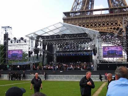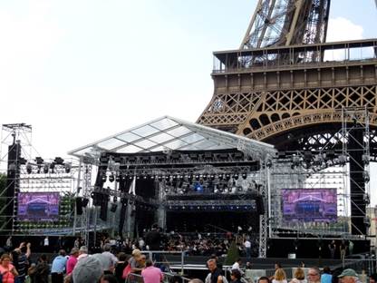 stage at the foot of the Eiffel Tower, with the national orchestra practicing