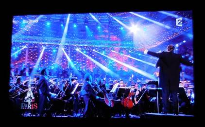 magnificence, but it’s hard to pull off a sad, delicate theme.” He did not fall flat on his face. He accomplished what looked like a miracle to me. Paris was on fire! Paris was being bombed! Paris was being reduced to ashes! That’s what this pyrotechnics show looked like. And the music, oh the music! That national orchestra and Radio France choir went on and on, and they were awesome. Christophe, the pyrotechnics master artist, humbly said “the music makes the show.” For the first time, fireworks were shot directly from the tower. When they were shooting out from the top section of the tower, I ran over to the kitchen window to see. Christophe used fire, at several points, all along the two levels of the tower. “Pyrotechnics is like trying to play the piano wearing boxing gloves,” he said. Miraculous, and moving.