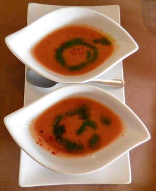 complimentary little bowls of gazpacho were given to us at Le Court Bouillon