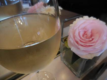 glass of white wine from Bergerac, and a pink rose, by a mirrored wall. |