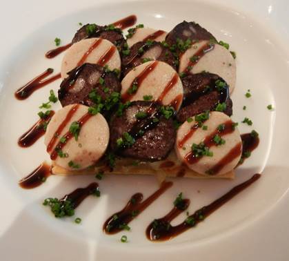 The starter course we shared, a duo of boudin, half white, and half dark (blood sausage), was