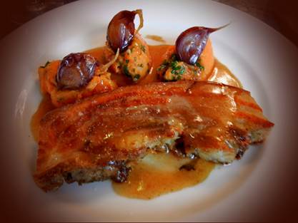 de chochon a la plancha, écrasée de potates douces, ail violet et jus de