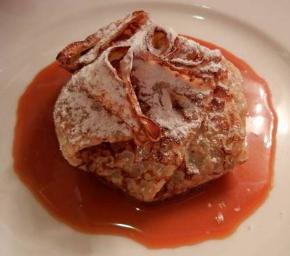 potatoes and roasted garlic that accompanied it. The dessert to order at Cristal de Sel is the aumônière de crêpe aux pommes confits, caramel au beurre salé. It is