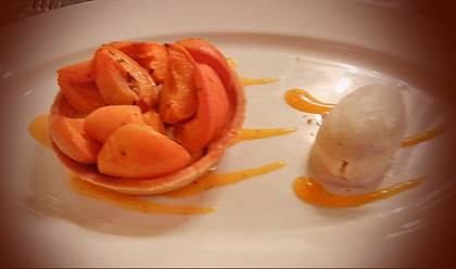 perfectly cooked and seasoned apples and its fantastic caramel sauce. My dessert, a small tarte abricots/verveine, crème