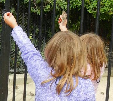 girls enjoyed feeding sparrows at Notre Dame (an activity that has gone on