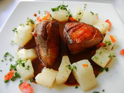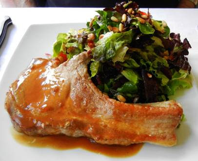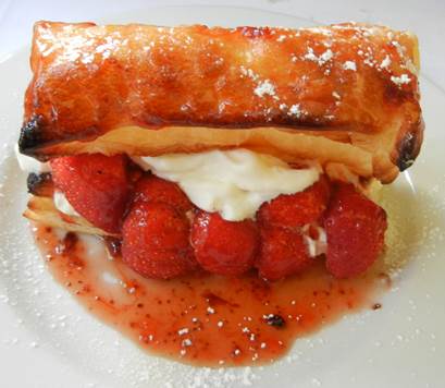 who ordered the duckling with roasted white radishes. Tom had a yummy pork chop. And he had the strawberry feuilletée, which was tasty and beautiful. The chairs were comfortable