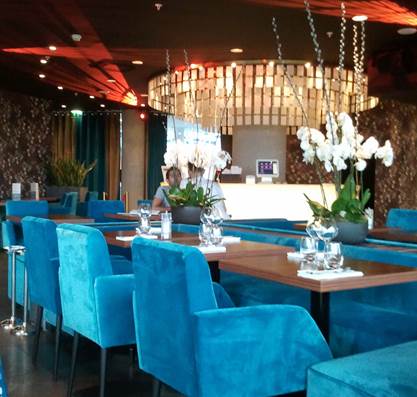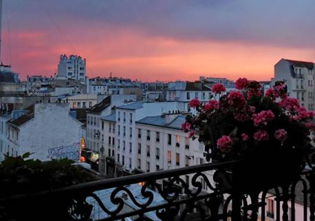 Lisa sent me a message yesterday, saying that if she were in Paris now, she’d go to the Musée du Quai Branly to see the Tiki exhibition. She’d also go to La Tresorerie, “a new housewares store that I hear is beautiful,” she said. When Lisa says something like that, we listen. Not only does she have exquisite taste, but she also is a dynamite businesswoman who, along with her business partner Noel, created the Harmony Ball Company (here’s their story). I wrote back to her that we did see the Tiki exhibition. I didn’t mention it when I wrote about our visit there because we only spent about 10 minutes looking at it. Then it was time for us to meet our friends at the café. “Tiki Pop” is the name of the exhibition because it focuses on the popular American myths about the South Seas culture that fueled so many popular songs, decorative objects, shows, and even theme restaurants like the former Kahiki in Columbus, where Tom and I used to live and Lisa still does. It was a 1950s and 1960s phenomenon in American culture. “Tiki Pop” is a fun, cute exhibition, located on one of the modestly sized mezzanines of the museum. Lisa’s interest in La Tresorerie means that we must go there. An easy ride on the line 8 from Commerce to Republique, the trek will be our first foray into the Right Bank this summer. Now that I see, on her Facebook page, that Lisa has another company, Areaware, I further understand her interest in a housewares store. She’s a busy, talented lady. We will go to La Tresorerie, and report back to Lisa. We almost ventured as far as the Right Bank yesterday evening when we walked along the Allée des Cygnes (also called the Île aux Cygnes). In fact, we wondered, as we walked, whether this island in the Seine is considered to be in the 15th, or the 16th arrondissement? Wikipedia is no help; it says the Île is in both. No wonder the Île is in a perpetual state of some kind of neglect; neither arrondissement is taking responsibility. Still, pedestrians like us love the place as a calm and leafy walkway, away from noisy automobiles and buses. We stepped into Panoramic at Beaugrenelle on our way back up the rue Linois. Although the weather was not so blazingly hot as on Friday, the humidity was elevated; Paris was muggy. Rain had been drizzling. We rode the escalators up through the air-conditioned mall to the top level, where Bermuda Onion is located. According to its web site, this Parisian restaurant considers itself to be “mythical,” a celebrated place from the Paris of the 1980s. It was a swish resto in the former Beaugrenelle shopping mall. The Noctis restaurant group, which owns twenty-some Paris eateries, is the new Bermuda Onion’s proprietor. The Onion’s décor is inspired by the 1950s, and its cuisine unites “modernity and quality.” That’s a fair description found on the resto’s web site. Because we did not have a reservation, we were not seated right by the window. But Tom did have a fairly good view out over the Seine. I had a nice view of the attractive restaurant’s interior. The Onion is one of those places where Parisians go to indulge in an expensive hamburger. Tom ordered that, and it was very good, even if the bun was one of those fragile brioche-y things. It came wrapped in waxed paper made to look like a newspaper from Honolulu of the early 20th Century. Served with fries, this burger cost 21 euros ($28). I ordered the supreme de pintade (Guinea hen) for only 19 euros. It came in a sauce of finely puréed sweet potatoes, with a foam of citronelle (lemongrass) on top. I’m not crazy about this foam trend, but the dish was delicious. The Onion’s Chef Valentin Néraudeau has earned my respect. And the service was excellent, too. I’d made an appetizer earlier, before our walk, at the apartment. We didn’t feel the need for any dessert, so the dinner was not long. When we left the restaurant and shopping mall, the drizzly rain had given way to a lovely sky, headed for a beautiful sunset.