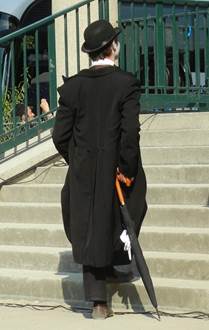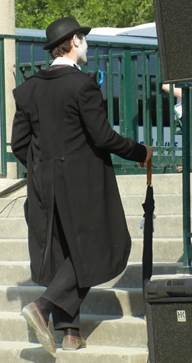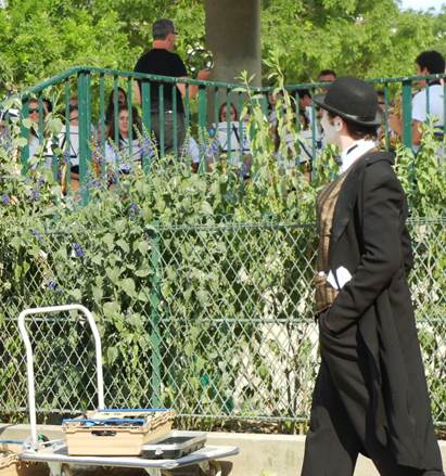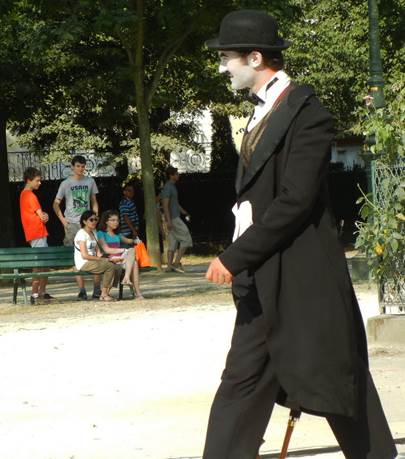 mime approaches stage on the Champ de Mars, climbs steps, and then is asked