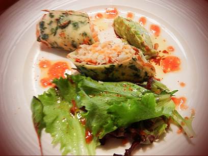 crêpe d'herbes farcie de tourteau et légumes croquants, mousse d'avocat