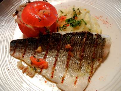 royale grillée, tomate à l'écrasée de pommes de terre et olives noires. These