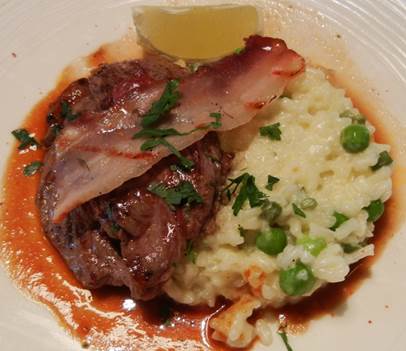 de jeune bovin, pancetta grillée, risotto verdurette.