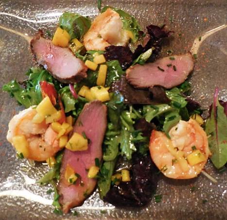 bicyclists. Tant pis. I made a reservation for Bistro 121, because it was Sunday, and that bistro was open. The food is so dependably good at this Bistro, especially the sauces, and service is warm and friendly. The interior is spacious and comfortable, and it is a good, 20-minute walk from the apartment. Bistro 121 did not disappoint. We shared a shrimp and duck salad. The cool crispy salad was a nice contrast to the warm, grilled shrimp. The thin, cool slices of duck breast tasted just like roast beef. Bits of mango were a nice, fruity touch.