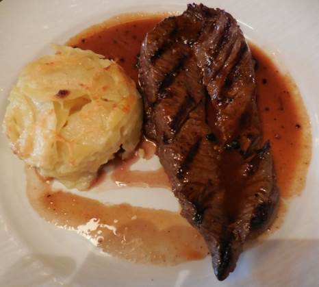 Tom then had the onglet de jeune bovin, one of the better steaks he’s eaten in Paris. It is not big, but it is tender enough and very tasty. Best of all, it comes with one of Chef Eric’s yummy sauces, a reduction sauce that is savory and flavorful. The dauphinois potatoes are the perfect accompaniment.