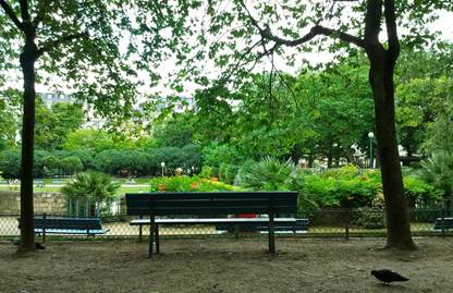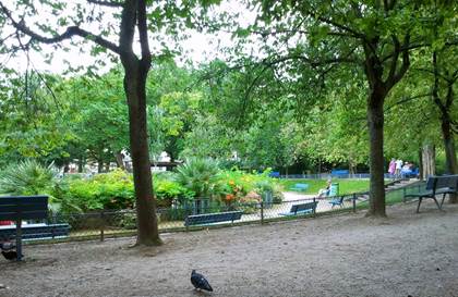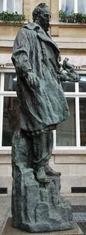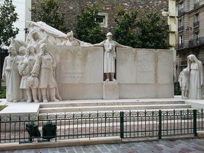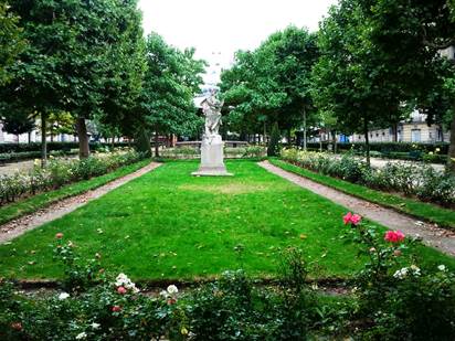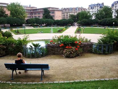We both finished working by early afternoon yesterday, so we went for one of our favorite Paris walks before we settled back in to watch the end of the Tour de France stage of the day. This walk begins with a normal stroll down the rue du Commerce toward the picturesque old village church at the end, the church of Saint John the Baptist of Grenelle. It is the centerpiece of the Place Etienne Pernet. The article about Etienne in Wikipedia has changed since I read it last. Now it reflects the real person a bit more, I think. He came from a somewhat deprived, rural background, but felt the calling to become a priest. His mother did nothing to discourage him. His passion was helping the working poor. He met a woman named Antoinette Fage in about 1864, and with her and a couple of nurses, he began the process that would establish the order of the Little Sisters of the Assumption. The approval of this congregation came in 1897. The working poor have tough lives. When someone in the family falls ill, the tough lives become almost impossible. The Little Sisters of the Assumption dedicated themselves to the nursing of these ill, poor people in their homes. They helped everyone, not just Roman Catholics, in the true Christian way. Today, the order of the Little Sisters operates in a half dozen U.S. cities, including Worcester, Massachusetts, where they have established the Pernet Family Health Service. This non-profit provides family-centered health and social services, with a goal of strengthening families and communities. Etienne would be pleased with that, I think. In this walk, we turn left and proceed down the rue des Entrepreneurs toward the Square Saint-Lambert, a beautiful park on the grounds of a former ugly gas-works. The point of the park where we enter is built up, because that’s the way the terrain of the gas-works was built. We take the leafy, sloping path up to the top of this rise, then we are in a curved allée of mature trees, overlooking the rest of the park, where there are glorious flowerbeds, green lawns for lounging in the sun, a fountain in a circular pool, a puppet theatre, a children’s playground, and a merry-go-round. A large middle- and high-school faces the park on its north side. It is named for Camille Sée, a politician who promoted the French law that established schools for girls (1880). Simone de Beauvoir taught school here in 1939. We always pause for a little while on one of the blue, wooden park benches in this park. This is a family-oriented park, not a touristic place at all. We exit the park at the opposite point, on the rue Léon Seche, passing by a seafood restaurant that we always mean to try, L’Armandie. We cross the square intersection at a diagonal, and then we are at the corner of the Place Hubert Monmarche. A somber memorial to the soldiers killed in World War I and the war in Indochina rests there. Yesterday evening, we noticed that the stone memorial has been cleaned. Even though it is whiter now, it is still somber. When we pass the memorial, we are in the elegant, formal square in front of the dignified town hall of the 15th arrondissement. Technically, this is the rue Peclet, but the street is not really apparent until you reach the far side of the square, where a bistro and a brasserie have their terrasses facing the town hall and the park named for Adolphe Cherioux. We stopped to admire the statue in front of the town hall. The sculptor Emile Antoine Bourdelle made it, and it features his fellow sculptor, Jean-Baptiste Carpeaux, at work. (Bourdelle’s workshop was in the 15th, and is now the Bourdelle museum.) Walking through the length of the Place Adolphe Cherioux is an uphill trek. Here, we are actually beginning to climb the hill that is Montparnasse. Mid-way through this formal Frenchy park is one of those graceful gazebo/bandstands. At the end of August, the police drum corps will perform here. We made a note to attend. At the far end of this park, we exited and crossed the rue de Vaugirard. After walking a short distance to the left, we turned right and entered the private little street called the Square Vergennes. At the end of this utterly charming lane was the former workshop/home of Louis Barillet, an artist whose medium was glass. The building itself is a work of modern art by Robert Mallet-Stevens (1932). We noticed that this year, the museum has changed; the family of the artist Maurice Mendjisky (1890-1951) has turned it into a museum dedicated to him and to the art of the two “Schools of Paris.” The first School of Paris includes the work of mostly immigrants, principally from central Europe, who arrived in Paris at the beginning of the 20th Century and who set up shop in the Montparnasse area. They include Modigliani, Chagall, Soutine, and others. The second School of Paris occurs post-WWII, between 1945 and 1960, and includes artists like Gerard Pignon, Jean Bazaine, Maurice Esteve, and Alfred Manessier. Maurice Mendjisky fell in love with Kiki (famous model in Montparnasse) in 1919, and lived with her for three years, until she left him. She’s the subject of the painting that’s on the poster for the museum’s current exhibition. Walking back up to the rue Lecourbe, we detoured for a short distance down the rue Petel to take a look at a couple of old, village-y houses and an interesting bistro called Intuition Gourmande. Rain began to drizzle, so we walked up along the rue Peclet to the rue Mademoiselle rather than through the dirt paths of the Square Saint Lambert. That took us past the Cinema Chaplin, at the corner of rue Léon l’Hermitte. I’d say it is an artsy cinema, not a place showing the latest popular movies. We opened the umbrellas and strolled along the rue Mademoiselle and rue Lakanal toward the rue du Commerce and home. While we watched the end of the day’s Tour de France
