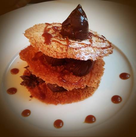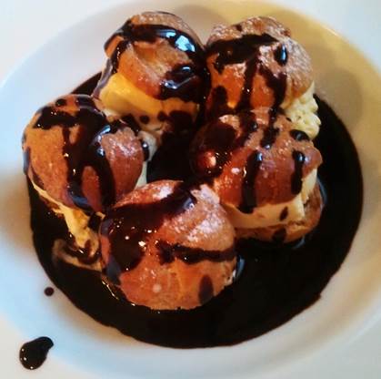 Tom asked me, as he often does, to find an example of something in particular that he could use in his textbook. I was particularly pleased with what I eventually found, and so was he. Best yet, the editor in New York liked it. I think this contributed to a celebratory feeling that crept over me as we walked through the Champ de Mars yesterday evening. So even though we’d had an extra special dinner the night before (at Axuria), and had planned to simply go to the neighborhood pub for a light dinner, we changed our minds on the way back down the rue du Commerce. “Let’s do it,” I said. “Let’s try Le Pario! Even if they can’t take us because we don’t have a reservation, we could make one for the next night and then go on to the café instead. But maybe we can get in!” Tom is always game for a great dinner, so we veered to the right, down the avenue Emile Zola. When we were near the end of it, we crossed the street and entered Le Pario. This space is very familiar to us; it was the home of Oh! Duo, a small restaurant where we’ve enjoyed many traditional French dinners over the past 16 summers. Then at last the duo, Joel and Françoise Valero, retired to Epernay. Oh! Duo is no longer. That happened last July, and in August we were excited to learn that the brilliant young chef, Eduardo Jacinto Alvelar, of Café Constant fame, would be opening his own restaurant there. This is how we learned about it (my Paris Journal entry for August 9, 2013). Chef Eduardo opened Le Pario in September, while we were still in Paris but by then we’d moved into our September digs in the 6th arrondissement, and we were all wrapped up in things happening over there. We’ve been curious about the name of the restaurant. What does “Le Pario” mean, we wondered? A Michelin review explains it: this is the restaurant that is mid-way between Paris and Rio. You see, the chef is originally from Brazil. When we entered, we were warmly greeted by a number of young people working there. We knew that Chef Eduardo had renovated the space, because we saw him working on it himself last August. However, we were surprised at the extent of the changes. The duo of Joel and Françoise always wanted to keep their restaurant small; hence the name, Oh! Duo. Joel would only have one person helping him in the kitchen, and Françoise would only have one person (if that) helping her in the dining room. They only used the upstairs for special events, for larger groups, or once in a long while they’d allow themselves to be busy enough to seat some customers up there when the main dining room was full. Le Pario is a much more ambitious undertaking. The staff is substantial. I’d guess there were at least ten, maybe a dozen, people working there last night. The counter has been removed in the downstairs dining room to make way for a couple more tables, yet the little table under the stairs, where we often sat, is gone – replaced by a useful cabinet. We were shown to the upstairs. It is elegant; and it is substantially air-conditioned, in a very non-French way. I’d say this air conditioning approaches Florida style – must be the Brazilian in him, I thought. Fortunately, we’d arrived a little before 8PM. By the time we left, the upstairs was nearly full, and the downstairs was definitely full. We absolutely must reserve in the future. The cuisine is hard to describe. It is modern, and unique. The Brazilian influence is apparent, and so is the French. There is nothing “country” about this food; you know you’re in a real city when you dine at Le Pario. The only “country” item I noticed was that half of the bread in the basket was Poilane-style. The starter course that we shared was a gelée de Homard, éffiloché de chair de crabe, queues de langoustines, cuites vapeur, velouté de céleri rave. That translates to something like lobster jelly with bits of steamed crabmeat and langoustine tails, topped with a cream of celery root. Some say langoustines are prawns; but I think, as I explained days ago, that they are really small, skinny lobsters. Anyway, this concoction was attractively arranged and served in a martini glass. It was delightful. My main course was a rable de lapin – a “saddle” of rabbit, stuffed with dried fruits and nuts. It came with a sweet potato sauce not unlike the sauce I had with the Guinea hen at the Bermuda Onion – but better. Tom’s main course was small medallions (noisettes) of veal. It was gorgeous, and tasty. The servings were pleasantly small, so we both indulged in dessert. Mine was the profiteroles with dark chocolate sauce, and Tom’s was a “tuile” that consisted of layers of coconut-infused pralines with scoops of chocolate pudding (sweet milk chocolate and crème fraiche) in between (photo below).