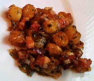 spheres, cooked with ham bits (lardons) in a nice sauce (spoonful of this side is shown