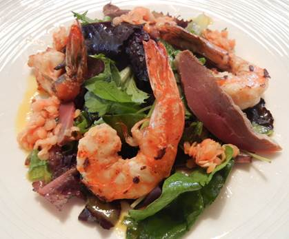 for us to share: gambas poêlées, lentilles corail à l'huile de noisette, magret séché,
