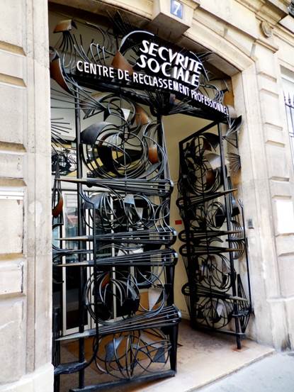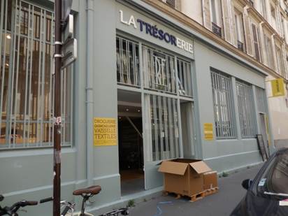 Our first metro ride of the summer was warm, crowded, and long. Line 8 is unusually long – beginning down at the bottom of the 15th and thrusting up and across the Seine at an important place, between Les Invalides and Place de la Concorde. Then it curves to the east as it goes north, skirting along the bottom border of the 10th arrondissement before curving again, this time to the south and east, almost all the way to the Bois de Vincennes. That would be far enough, you’d think, but it goes on. Well outside the Peripherique, Line 8 ends at last, in Creteil, at that suburb’s town hall. So even though our ride was long, it wasn’t even half the full length of Line 8. We left the subway station at Republique, adeptly exiting at Sortie 5 so that we wouldn’t be far from our first goal for the day: La Tresorerie, at 11 rue du Chateau d’Eau, in the 10th arrondissement. Not only was it our first metro ride of the summer, it was also our first venture over into the right bank this year. Right bank traffic noise greeted us as we left the long, rectangular Place de la Republique and started walking along the boulevard de Magenta. Very quickly, we left the boulevard and began a short walk down the rue du Chateau d’Eau, which means literally “castle of water,” but I think was actually named for a water tower. We paused at number 7 to admire some terrific art deco metal work on the front doors of a Social Security center for retraining workers. La Tresorerie wasn’t far from there. Someone told our friend Lisa that this housewares store was beautiful. I’d say it was elegant, and interesting. We started by looking at the kitchen section, quickly selecting a little 3-minute hourglass timer that we need. The one that Tom uses back in Florida when he’s grilling steaks recently stopped working. The one we found at La Tresorerie is almost identical to our old one, but a little nicer. It cost only a few euros. We also selected some lovely cocktail/hors d’oeuvres toothpicks for 1.10; they’re almost too nice to use. Most things were overpriced. The showroom, with a soaring ceiling topped by a large skylight or verriere, was elegantly arranged and super-well lit. The showroom was spacious, not crowded or cluttered. We climbed the stairs to a mezzanine where a few modern coffee tables were displayed along with rag rugs of the sort that my grandmother used to make. I guess they’re in style again. You can see almost everything we saw in the shop if you peruse the www.latresorerie.fr web site. Products sold there are generally recyclable, fair trade items that are especially well-designed. The work of the artists/designers is respected. Much more so than most Parisian shops’ web sites, this one honors its location by providing some interesting information about it. Here’s a rough translation: The store is situated at 11 rue du Chateau d’eau, in the 10th arrondissement of Paris,