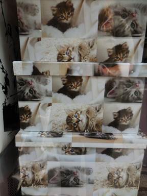Some of the things sold at La Tresorerie are clearly marked as “Made in France.” But the store also sells items made in Spain, Denmark, Portugal, Britain, Sweden, Norway, Germany, Italy, and Austria, according to a panel display. But we also saw a number of textile items that come from India. When we left La Tresorerie and turned onto the rue Lancry, I spotted several shops that sold imports from India – mostly textile items, especially colorful women’s clothing. Oddly included in the mix on the rue Lancry was a neglected building that was the home of the Federation Nationale des Blesses Multiples et Impotents de Guerre (National Federation of Multiply Wounded and Disabled War Veterans). The entire decrepit building is for sale – residences and offices included. Tom ventured into its beat-up porte cochere to take a look. A Chinese import shop nearby displayed cute kitschy things, but I found the realistic looking kittens sleeping on pillows to be ghoulish – they looked like dead kittens to me! I preferred the boxes covered with photos of cute kittens.