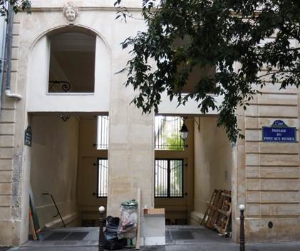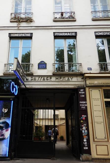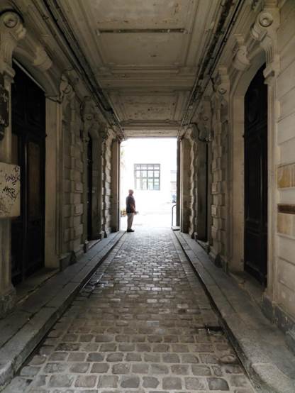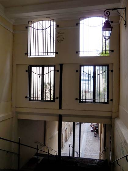 After we finished with the rue Lancry, we walked through a couple of old, neglected, covered shopping galleries called the Passage Meslay and the Passage du Pont aux Biches. The latter enclosed a set of stairs, taking us definitely into the Marais (a former swamp).