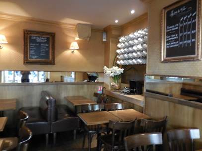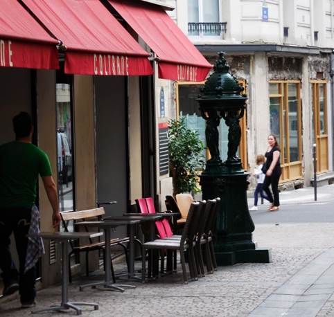 We continued on the rue Volta, named for the Italian scientist who invented the electric battery: a very important man! On this street we were pleasantly surprised to see a Wallace Fountain standing close to a café named for Coltrane. Despite the name, this place is not a jazz bar. It features a drink called the D…. M….. F….. (too obscene to spell out in this journal!).