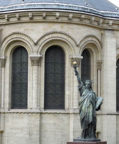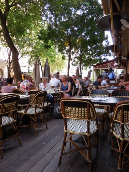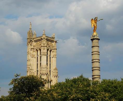 When we reached the rue de Turbigo, we took a brief detour off to the right to look at the exterior of the Conservatory and Museum of Arts and Crafts (really an industrial design school and museum). It is on the grounds of a former monastery, including the church of Saint Martin of the Fields (Saint Martin des Champs). We’ve been there before, but so long ago! Perhaps 15 years ago? We did not remember that there is a small Statue of Liberty behind the former church. It was a gift from Mr. and Mrs. Guillaume Duhamel. This bronze statue was made in 1878 from the plaster “execution model” which is 1/16 the size of the real thing. Across from this great school and museum of industrial design was a rather embarrassing British degree-mill called Horizons University. We didn’t see students because they take their courses online, and, for the most part, without textbooks (either paper or electronic)! Sacrilege!! Many blocks later, we reached our second goal for the day: Le Pere Fouettard, a brasserie/bistro of some size, located close to Les Halles, on a pedestrian street called Pere Lescot. The reason we wanted to go there: this is now the employer of Chef Laurent Houry. A decade or so ago, Laurent and his wife Isabelle owned a restaurant in the 15th called Le Tire Bouchon. We loved that place, and the Houry couple, too. We found Isabelle again a few years ago when she filled in for the patronne at Le Blavet for vacation-time one summer. We miss Le Tire Bouchon and Laurent’s cooking, so I periodically search for Isabelle and Laurent on the internet. The day before yesterday, I found them – or rather, him. I learned that he’s the chef de cuisine at this Pere Fouettard (Bogeyman) place. When we arrived, it was too late for lunch and too early for dinner, so we participated in Happy Hour. We shared a croque poulette (toasted, open-faced chicken and cheese sandwich on Poilane bread). The gruyere cheese was especially fine. Tom ordered fries, and they could not possibly have been better. We did not see Laurent; it was the wrong time of day. But it was so reassuring to know that he’s there. And now he does not have to worry about running the business. There is a manager who does that, and there is a nice woman who runs the “front of the house,” that is to say, the dining room and extensive terrasse. We did meet her, and we briefly saw the manager before we left. “What a great location,” we thought. Laurent and the rest of the team will never lack customers there in this bustling hot spot. The snack/late lunch restored us to the point where we could march on, and so we did. We passed by the busy Les Halles/Chatelet area, pausing to look at the ongoing reconstruction job at Les Halles. At the Seine, we passed by some of the bouquiniste (bookseller) stalls and took the Pont au Change over to the Île de la Cité. As we began to cross on that bridge, I stopped to take a few photos of the Paris Plage (Paris Beach) on the riverbank below us. What a huge success that project has been! The Hotel Dieu and the Conciergerie were looking fine beneath the French blue sky on that summery day. Looking back at the Chatelet statue and the Tour Saint Jacques, the sky was a bit cloudy. Still, the sun made the grand old gothic architecture of the Tour dazzle.