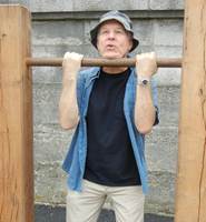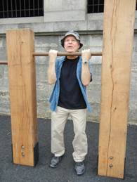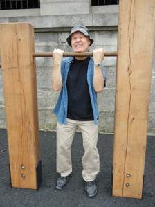 pretends to use the chin-up bars, but you see his feet remained on the
