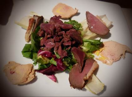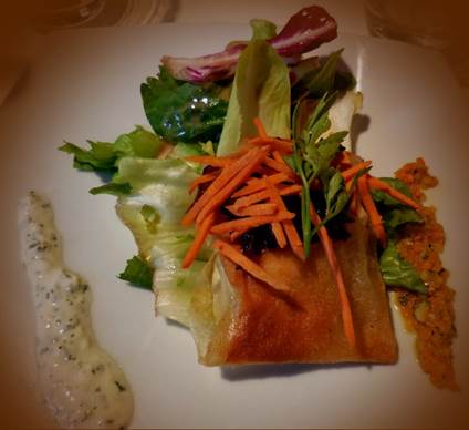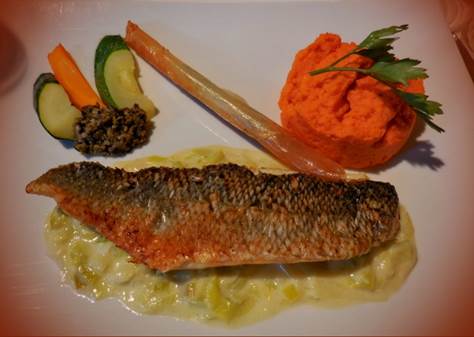 Last year, we never made it to dinner at Le Blavet on the rue de Lourmel, one of our longtime favorite restaurants in the 15th arrondissement. Although the resto now offers a two-course option, I think that for years, the three-course menu was the rule there. That’s usually more than we want. But the food there is always creative, beautiful, and freshly made. The dinners at Le Blavet are a marvelous value: three courses for 26 euros (two for 23). For a difference of only 3 euros, it doesn’t make sense to have only two. Le Blavet is small and out-of-the-way; reservations are a must, and they must be made by telephone – no lafourchette.com or email options here. When I called to reserve, the woman who answered the phone and booked our table was not the patronne. This woman was calmer than la patronne. When we arrived, the same server who has worked there for years seated us at the tiny table right in the front window. I don’t think we’ve ever been seated in the front room before. Soon, the reason became apparent. One by one, two by two, a large group of dressed-up young people entered the resto and went into the back room. I had no idea that room could hold so many! It seemed like 30 people went in, but it must have been closer to 20. Finally, a young man in a handsome, dark suit, and a young lady in a bridal gown entered. They stood by the bar while the server and hostess arranged rows of kir royals there. Then they each grabbed two glasses and walked into the back room, where they were greeted with loud applause and cheers. The wedding probably had taken place at the mairie (town hall of the 15th arrondissement) – a civil ceremony, as most weddings are in France. Some people opt to then have a church ceremony after the civil ceremony, but many do not. Throughout our dinner, we could hear much of the goings-on in the back room. Although most of the young people there were French, clearly the groom and best man were not. They gave their little speeches and toasts in English. One of them had learned British English, and the other spoke American English. I think they were either Dutch or German. Meanwhile, Tom and I enjoyed a spectacularly good dinner. Each of our starter courses was a salad, really, but what salads they were! Tom’s had slices of foie gras, smoked duck breast and confit of duck gizzards. While that last item may not sound good, trust me: it was great! My salad featured a croustillant of fresh goat cheese with candied onions on top. When Tom gave me a couple of the many slices of foie gras from his salad, I topped them with the candied onions and oh la la! Was that ever good! For my main course, I had one of the daily specials: a sea bass filet on a bed of softly cooked leeks in a creamy, buttery sauce, accompanied by a carrot mousse, a few veggies, and a little scoop of tapenade made with olives and anchovies. Delicious! And oh yes, a pastry stick with roasted fennel inside. Interesting!