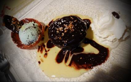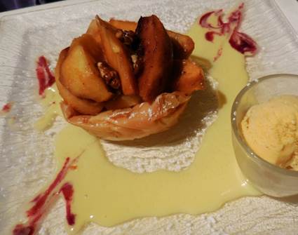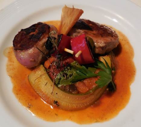 Tom had lamb which came in a sauce made of its juice with thyme and a confit of garlic (photo below). The accompaniment was a roasted olives-and-vegetable mix that was ratatouille-like, but stunningly flavorful (noisette de selle d’agneau, jus au thym a l’ail confit et olives aux legumes du sud).