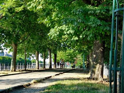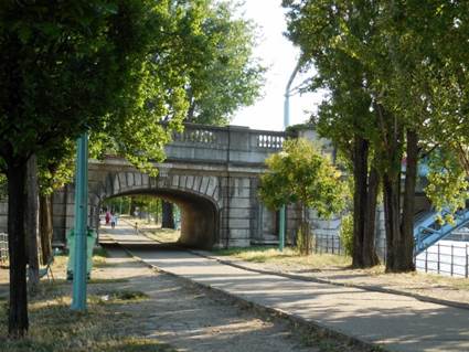 Dessert was a moelleux au chocolat for me, which came in a pool of crème anglaise, with a little scoop of terrific pistachio/mint ice cream and some whipped cream. Tom had the dessert of the day: an apple tart with crème anglaise and vanilla ice cream. Before dinner (and after a day of working at the computers and a bit of watching the Tour de France), we walked for a couple hours in the neighborhood, particularly enjoying the peaceful Île aux Cynges, away from the rush hour traffic. We stopped in Marks and Spencer, too, and bought a supply of coffee – some very dark French roast, and some rich Colombian from South America. And we could not resist buying a chunk of extremely sharp English cheddar cheese. The French don’t make anything like it. The walk home, after dinner, is one of our favorites, because we come up through an elegant group of buildings on a tiny L-shaped side street – the rue Edmond Roger -- and then walk the length of the classic Parisian park, the Place du Commerce. Back at the apartment, the plants on the balcony called out to us – they were so very thirsty, after such a warm and sunny summer’s day. As the sun set, we served them – Tom refilling watering cans, and I inching my way along the plant-crowded balcony, watering away.
